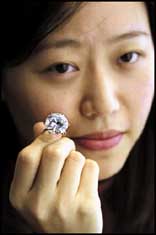 هونج كونج الصين أ,ف,ب: تامي تسوي مسؤولة العلاقات العامة في شركة كريستيز للمزاد فرع هونج كونج تعرض خاتماً من الماس وزنه 21,99 قيراطاً وذلك في أثناء عرض اعلامي قبل بدء المزاد، ومن المتوقع ان يباع الخاتم في المزاد الأول للمجوهرات ب320 400 ألف دولار أمريكي.