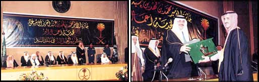 وبدأ الحفل بالقرآن الكريم ثم القى امين عام الجائزة الدكتور عبدالله بن حسين القاضي كلمة قال فيها ان هذه البلاد اضحت بفضل الله ثم بحكمة ولاة امرها منذ عهد الملك عبدالعزيز بن عبدالرحمن رحمه الله مروراً بابنائه البررة حتى هذا العهد الميمون بقيادة خادم الحرمين الشريفين الملك فهد بن عبدالعزيز وسمو ولي عهده الامين وسمو النائب الثاني حفظهم الله مبعثا للمودة والخير وحازت بذلك على الفضل والاحترام، واضاف انه في كل عام جديد نحن على وعد وترقب لهذه الجائزة وهذا العام هو العام الثاني للجائزة الفريدة من نوعها التي يصل اشعاع نورها الى كل الاصقاع وتعم بركتها كافة المحسنين في ارجاء البقاع.