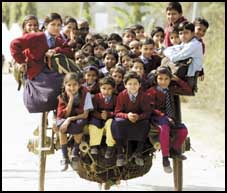 أكثر من خمسة وثلاثين طفلاً هندياً يمتطون عربة يجرها حصان لدى عودتهم من المدرسة.يذكر أن عدد المدارس الأولية الابتدائية في الهند قد وصل الى 590 ألف مدرسة في العام 1998م. ويبلغ سكان الهند الأميين 424 مليون نسمة وهو ما يفوق العدد الاجمالي لسكان أمريكا الشمالية واليابان.