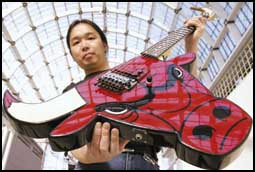 أحد موظفي شركة ESP للجيتار الياباني يحمل جيتاراً على شكل رأس ثور ضمن فعاليات معرض الموسيقى العالمي في فرانكفورت حيث شاركت فيه 2150 شركة عرضت منتجاتها الموسيقية .