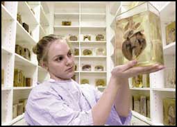 مسؤولة في التشريح الفني للأنسجة كلير لودون تحمل قلباً محفوظاً بإحدى مستشفيات سيدني حيث أظهر تقرير منشور بأن 25 ألف عضو من جسد الإنسان بما في ذلك المئات من قلوب الأطفال موجودة بالمستشفيات والجامعات والمتاحف وقد نزع بعضها بدون تصريح من أقارب الموتى.