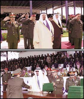 وفور وصول سموه ميدان العرض عزف السلام الملكي ثم استقل عربة مكشوفة تفقد خلالها مجموعات رمزية من افرع القوات المسلحة وبعد ان اخذ سموه مكانه في المنصة الرئيسية بدأ الحفل بالقرآن الكريم ثم القى قائد المنطقة الجنوبية اللواء الركن حسين بن عبدالله القبيل كلمة رفع فيها اسمى آيات التهاني والتبريكات لخادم الحرمين الشريفين وسمو ولي عهده الامين ولسمو النائب الثاني بمناسبة عيد الاضحى المبارك وقال الكل يعتز اليوم بزيارة سموكم الكريم لمختلف قطاعات المنطقة الجنوبية وينظرون اليها بأنها زيارة معايدة تجمع بين الاب وابنائه وبين الاخ واخوانه وبين المحب ومحبيه وهي زيارة تجمع القائد بجنوده متفقداً احوالهم داعماً بسخاء متطلباتهم.