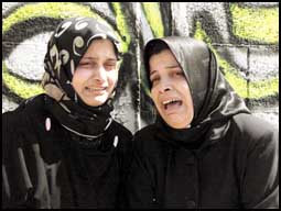 شقيقتا الشهيد الفلسطيني محمد جمعه ابو عون )20 عاما( تبكيان في لوعة واسى اثناء تشييع جنازة شقيقهما بمدينة غزة، وكان محمد جمعه ضحية رصاص الجنود الاسرائيليين عند معبر كارني.
