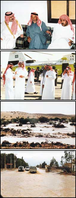 أفراد الدورية ومازال البحث جارياً عن المفقود الآخر وقد ساهمت طائرات الدفاع المدني في توصيل الخيام والبطانيات لمتضرري السيول الذين حوصرت بيوتهم ومزارعهم بالمياه.