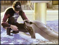 جيف اندروز المدرب بحديقة عالم البحار في سان دييغو يطعم حوتاً قاتلاً وزنه 5 آلاف رطل بعد نقله الى حوضه الجديد في «سان دييغو».وقد نقل الحوت البالغ من العمر 25 سنة من متحف الأحياء المائية بفان كوفر بعد وقف عروض الحيتان القاتلة هناك.