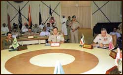 وفي بداية الاجتماع ألقى رئيس هيئة الاركان العامة الفريق الاول الركن صالح بن علي المحيا رئيس الاجتماع كلمة رحب فيها برؤساء الوفود ونقل لهم تحيات وتمنيات صاحب السمو الملكي الأمير سلطان بن عبدالعزيز النائب الثاني لرئيس مجلس الوزراء وزير الدفاع والطيران والمفتش العام بأن يخرج الاجتماع بالنتائج المرجوه التي تدفع بالعمل العسكري المشترك بين دول المجلس لما فيه خيرها. وبيّن المحيا أن قيام مجلس التعاون جاء ترجمة صادقة لرغبات أبناء دول المجلس وطموحات قادتها ، مشيرا الى ان التعاون العسكري حظي كغيره من المجالات بالكثير من الدعم وقطع خطوات كبيرة في توحيد المفاهيم وتبادل الخبرات. بعد ذلك بدأ الاجتماع بمناقشة العديد من الموضوعات المدرجة على جدول الاعمال التي تتعلق بتعزيز مجالات التعاون العسكري بين دول المجلس. وسيناقش الاجتماع على مدى يومين الموضوعات ذات الاهتمام ومتابعة تنفيذ مشروعي الاتصالات المؤمنة وحزام التعاون بالاضافة الى تطوير قوة درع الجزيرة ومجالات التعاون العسكري الاخرى.