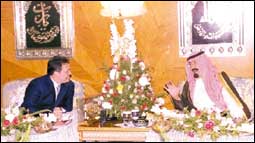 وحضر الاستقبال والعشاء صاحب السمو الملكي الأمير نواف بن عبدالعزيز وصاحب السمو الملكي الأمير عبدالاله بن عبدالعزيز أمير منطقة الجوف وصاحب السمو الأمير فيصل بن عبدالله بن محمد آل سعود وكيل الحرس الوطني للقطاع الغربي وصاحب السمو الملكي الأمير بندر بن سلطان بن عبدالعزيز سفير خادم الحرمين الشريفين في واشنطن وصاحب السمو الملكي الفريق أول ركن متعب بن عبدالله بن عبدالعزيز نائب رئيس الحرس الوطني المساعد للشؤون العسكرية وصاحب السمو الأمير تركي بن عبدالله بن محمد ال سعود المستشار في ديوان سمو ولي العهد وصاحب السمو الأمير الدكتور بندر بن سلمان بن محمد آل سعود المستشار في ديوان سمو ولي العهد وصاحب السمو الملكي الأمير فيصل بن تركى بن ناصر بن عبدالعزيز وصاحب السمو الملكي الأمير منصور بن عبدالله بن عبدالعزيز وصاحب السمو الملكي الأمير ماجد بن عبدالله بن عبدالعزيز ومعالي وزير المالية والاقتصاد الوطني الدكتور إبراهيم العساف ومعالي رئيس ديوان سمو ولي العهد الاستاذ ناصر الراجحي ومعالي المستشار في ديوان سمو ولي العهد الاستاذ عبدالمحسن بن عبدالعزيزالتويجرى ومعالي رئيس الشؤون الخاصة لسمو ولي العهد الاستاذ ابراهيم بن عبدالرحمن الطاسان.من جهة اخرى تلقى صاحب السمو الملكي الأمير عبدالله بن عبدالعزيز ولي العهد ونائب رئيس مجلس الوزراء ورئيس الحرس الوطني اتصالاً هاتفياً أمس من فخامة الرئيس ياسر عرفات رئيس دولة فلسطين.