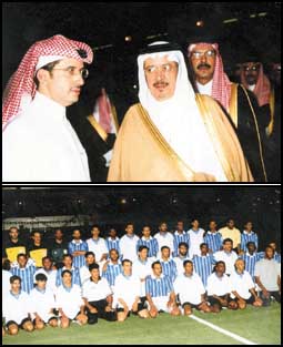 وبين شوطي المباراة اقيم الحفل الخطابي الذي بدأ بالقرآن الكريم رتله محمد بن راشد الغنيم.. ثم القى رئيس نادي الحمادة الاستاذ ناصر بن سعد السديري كلمة النادي رحب فيها بالحضور وشكرهم على تلبية دعوة النادي وقال ان اهم انجاز حققه نادي الحمادة هو التشرف بالسلام على مولاي خادم الحرمين الشريفين الملك فهد بن عبدالعزيز حفظه الله ورعاه كأول فريق في الدرجة الثانية.. واضاف انني لا انسى في هذه المناسبة توجيهات ودعم سيدي صاحب السمو الملكي الامير سلمان بن عبدالعزيز امير منطقة الرياض والتي كان لها الاثر الكبير.. وكذلك توجيهات سيدي صاحب السمو الملكي الامير سطام بن عبدالعزيز نائب امير منطقة الرياض ودعم وتوجيهات صاحب السمو الملكي الامير سلطان بن فهد بن عبدالعزيز الرئيس العام لرعاية الشباب وسمو نائبه صاحب السمو الملكي الامير نواف بن فيصل بن فهد وشكر نجوم الكرة السعودية على مشاركتهم في هذه المناسبة وعلى رأسهم لاعب الهلال الدولي السابق يوسف الثنيان.. واكد اننا في هذه المناسبة نشارك في تكريم نادي الهلال الشقيق بمناسبة حصوله على افضل فريق اسيوي لعام 2000م وكذلك اللاعب الكبير والخلوق نواف التمياط لحصوله على أفضل لاعب آسيوي لعام 2000م.. واوضح ان الهدف من هذا التكريم هو التواصل بين الاندية السعودية والجماهير الرياضية.. وأضاف انني لا أنسى دور الاعلام الرياضي ووقوفه مع النادي منذ ترؤسي له وهذا ليس بغريب على اعلامنا الرياضي الذي يشارك ويساهم مع انديتنا الرياضيه.