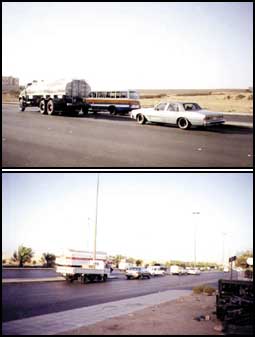 وبالتالي أصبحت الاستفادة من هذه المنافذ الثلاثة عكسية! فالفكرة من حيث المبدأ سليمة في حين أن التنفيذ خاطئ تماماً، أما باقي المنافذ البالغ عددها 23 فحدث ولا حرج إذ ان تصميمها خاطئ من الأساس ولم تجر عليها أية محاولات تعديل وهذا الأمر مشاهد يومياً ولعل الصورة )أ( توضح تعرض سيارتين لحادث اصطدام من هذا النوع في أحد المنافذ علماً بأن المنفذ لا يتضمن أشجاراً تحجب الرؤية وإلا كان الوضع أسوأ بكثير.