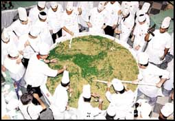 مجموعة من الطباخين في دبي يضيفون اللمسات الأخيرة على أكبر طبق من الباباغنوج حيث استخدموا أكثر من 700 كجم من الباذنجان والمقادير الأخرى لصنع هذا الطبق العملاق الذي تم توزيعه على الجماهير التي احتشدت للحصول على كمية منه.