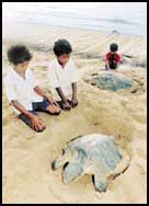 سلاحف بحرية خرجت الى الشاطئ لتضع بيوضها وسط متابعة من اطفال هنود دفعهم حب الاستطلاع لمراقبة عملية وضع البيض.