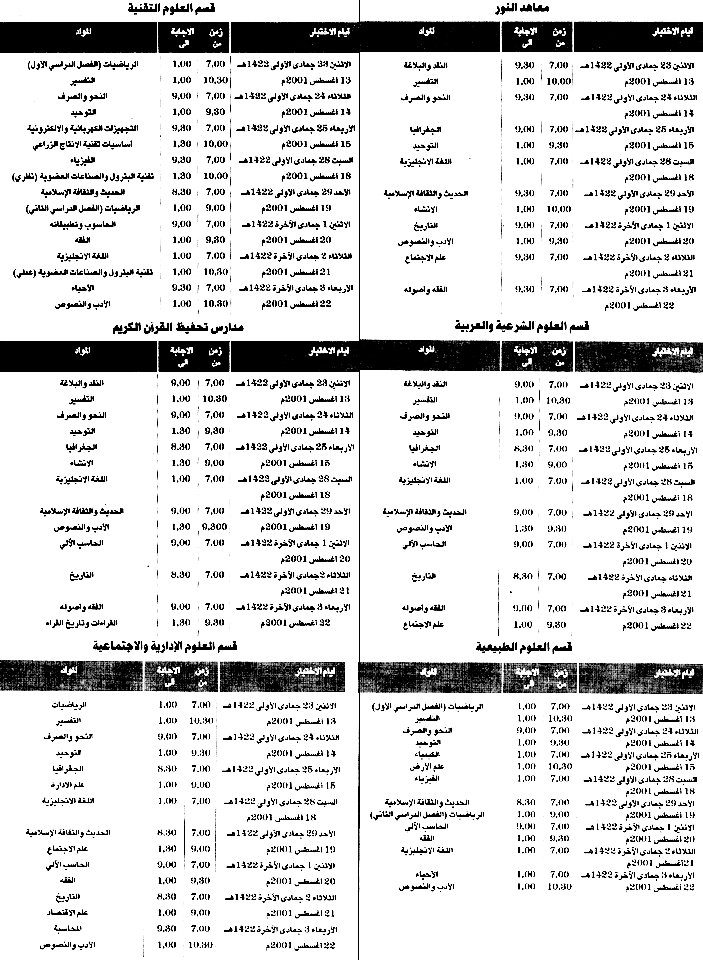 أصدرت وزارة المعارف جداول اختبار الثانوية العامة للدور الثاني للعام 14211422ه بأقسامها الأربعة وثانوية تحفيظ القرآن الكريم ومعاهد النور: