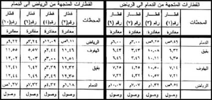 اعلنت المؤسسة العامة للخطوط الحديدية أنه تم تعديل جدول مواعيد سير رحلات قطارات الركاب «طوال أيام الأسبوع» وذلك اعتباراً من يوم الأربعاء القادم الموافق 20/4/1422ه وذلك حسب الجدول المبين أعلاه.
