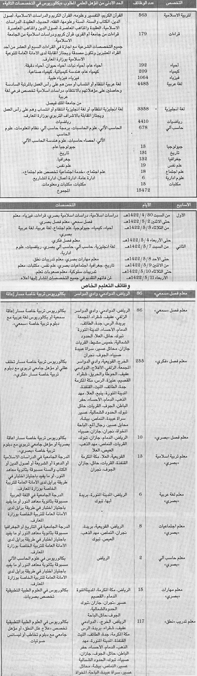 وسيبدأ استقبال طلبات راغبي الالتحاق بهذه الوظائف لاجراء المقابلات الشخصية لدى ادارات التعليم بوزارة المعارف اعتبارا من يوم الثلاثاء الموافق 26/4/1422ه كما يلي: