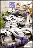 رجال الطوارئ الكوريون يحاولون إخلاء السيارات التي تكدست في هيئة أكوام بسبب مياه الفيضانات في شارع مجاور لضفاف النهر بالعاصمة سيول التي اجتاحتها أمطار غزيرة تسببت في مصرع وفقدان 21 شخصا على الأقل.