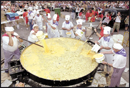 فريق من الطهاة الاسبان يقوم بخفق البيض في قدر ضخم لاعداد اكبر طبق من عجة البيض على الطريقة الاسبانية في محاولة لدخول موسوعة جينيس للارقام القياسية.