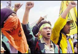 وقد تظاهر حوالي ألفي طالب لفترة قصيرة أمام البرلمان وهم يهتفون بشعارات معادية للجيش ولحزب غولكار، حزب الرئيس الاسبق سوهارتو، الذي يعد ثاني تشكيل سياسي في البلاد قبل ان يتفرقوا.