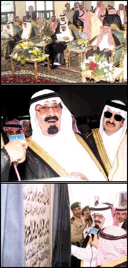 بعد ذلك قام صاحب السمو الملكي الأمير عبدالله بن عبدالعزيز بإزاحة الستار عن اللوحة التذكارية للمشروع قائلا .. بسم الله الرحمن الرحيم .. وعلى بركة الله .. اللهم اجعل فيه البركة والتوفيق ان شاء الله آملين ألا يتعرض فيه أحد لأي حادث إن شاء الله .