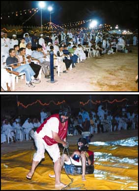 ** من جانب آخر ارتفعت حدة وحرارة التنافس في الالعاب المائية والتحدي «تلي ماتش» واللافت للانتباه أن الحضور لا يهدؤون ولا يستقرون على مقاعدهم بل ان الحماس يعتبر هو سيد الموقف فالجميع تراهم ما بين «روحة وجية» ومابين« وقوف وجلوس» يشجعون ويتابعون واصوات بعضهم تغطي على صوت «المعلق» الذي صوته بدوره «يشق طبلة الاذن» من فرط الحماس! وكانت المنافسات في البداية تقتصر على الحضور والزوار الذين يأخذون الارقام من البوابة ولكن «حدة المنافسة» قادت طاقم مطعم «الجزيرة» للانخراط في تحد قوي.. اعقبهم انخراط«فريق التايكوندو» للاستعراض بقيادة الكابتن محمد العصيمي.. حيث دخل الفريق في تحد قوي في محاولة لكسب الجولة ومع هذه «التحديات» ودخول عناصر أخرى من الشباب المتدرب في كمال الاجسام يتوقع ان يدخل مارثون«تلي ماتش».. فصلاً جديداً من فصول المنافسة القوية.. مع هذا الفصل يتوقع ان يستمتع الحضور ويطلقون العنان ل«ضحكاتهم» و«لكريات الدم الحمراء» ان تتجدد.. كنتيجة طبيعية لما يرافق «هذا المارثون» من استمتاع جميل يطول الجميع صغاراً وكباراً شيباً وشباباً.