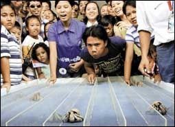 في اطار الاحتفالات التي تقام في كل انحاء اندونيسيا بمناسبة اليوم الوطني للبلاد اقيم هذا السباق الطريف لسرطانات البحر في جاكرتا وحرص المشاركون على تشجيع حيواناتهم ليكسبوا جائزة السباق الكبرى وسط ضحكات الجمهور الذي اعجبه عناد بعض السرطانات ورفضها التحرك،