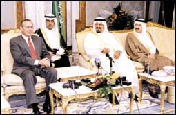 وبيّن سمو النائب الثاني في مؤتمر صحافي عقده في ساعة متأخرة من ليل أمس الاربعاء بقصر سموه بالعزيزية بمدينة الرياض بحضور معالي وزير الدفاع الأمريكي السيد دونالد رمسفيلد بيّن سموه ان الولايات المتحدة الأمريكية لم تتقدم بأي طلب للمملكة لانطلاق ضربات عسكرية تجاه أي بلد عربي أو إسلامي..