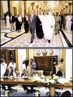 وبيّن سمو النائب الثاني في مؤتمر صحافي عقده في ساعة متأخرة من ليل أمس الأول بقصر سموه بالعزيزية بمدينة الرياض بحضور معالي وزير الدفاع الأمريكي السيد دونالد رمسفيلد بيّن سموه ان الولايات المتحدة الأمريكية لم تتقدم بأي طلب للمملكة لانطلاق ضربات عسكرية تجاه أي بلد عربي أو إسلامي..