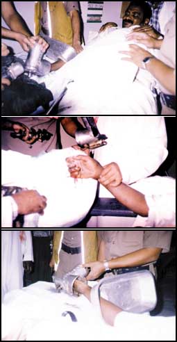 وتم عمل فتحة مثلثه في جانب الفرامة متصلة في الجزء المقطوع من الاسفل ومن ثم تم ادخال رأس آلة فتح الابواب اليدوية الهيدروليكية في تلك الفتحة المثلثة لكسر جسم الفرامة واستخراج يد العامل حيث لم تصب اليد الا ببعض الجروح والكسور في أنامل الاصابع والعامل حاليا يتمتع بصحة جيدة ولله الحمد.