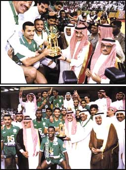 توج صاحب السمو الملكي الأمير نواف بن فيصل بن فهد نائب الرئيس العام لرعاية الشباب نائب رئيس اللجنة الأولمبية أفراد منتخبنا الوطني الأول للكرة الطائرة ابطالاً للبطولة الرابعة للمنتخبات بمجلس التعاون لدول الخليج العربية بعد تغلبه مساء أمس على نظيره القطري بثلاثة أشواط دون مقابل في اللقاء الذي جمعهما على صالة رعاية الشباب بالرياض، وقد قدم نجوم الأخضر لوحة فنية رائعة أكدوا من خلالها تفوق الكرة الطائرة السعودية على المستوى الخليجي. شاركهم في ذلك الحضور الجماهيري الرائع والوقفة الصادقة من قبل لاعبي منتخبنا الوطني الأول لكرة القدم والذين حضروا لمؤازرة زملائهم لاعبي منتخب الطائرة.