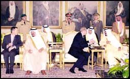 وقد جرى لفخامته استقبال رسمي على أرض المطار حيث عزف السلامان الوطنيان للبلدين ثم استعرضا حرس الشرف.. بعد ذلك صافح فخامته مستقبليه صاحب السمو الملكي الأمير متعب بن عبدالعزيز وزير الاشغال العامة والاسكان وصاحب السمو الملكي الأمير سعود الفيصل وزير الخارجية وصاحب السمو الملكي الأمير خالد بن سلطان بن عبدالعزيز مساعد وزير الدفاع والطيران للشؤون العسكرية وصاحب السمو الملكي الأمير سلطان بن سلمان بن عبدالعزيز الامين العام للهيئة العليا للسياحة وصاحب السمو الملكي الأمير عبدالعزيز بن عبدالله بن عبدالعزيز المستشار في ديوان سمو ولي العهد وأصحاب المعالي الوزراء وكبار المسؤولين من مدنيين وعسكريين.. وبعد استراحة قصيرة في صالة التشريفات بالمطار تناولا خلالها القهوة العربية صحب سمو ولي العهد ضيفه الكبير في موكب رسمي إلى المقر المعد لاقامته.