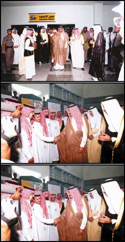 ثم اطلع صاحب السمو الملكي الأمير سلمان بن عبدالعزيز في صالة القدوم على سيور العفش وتجهيز الصالة وشاهد سموه سيارات الاجرة في المواقف.