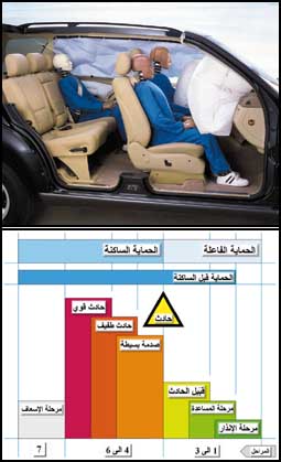 5 الحادث البسيط وعندها تتدخل وسائل اخرى لامتصاص قوة الصدمات في المقدم والمؤخر والجانبين وتوزيع تلك القوة لتبديد اثرها مع تشغيل نظام شد أحزمة الحماية (بضعة سنتمترات لتقريب كل من الركاب الى ظهر مقعده) وتشغيل ما يلزم من الوسادات/ الستائر الهوائية بالمقدار الملائم وحيث تدعو الحاجة الى ذلك (لا ينتفخ الحزام مثلاً امام/ قرب مقعد شاغر أو فيه مقعد الطفل)،