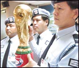 رجال الأمن يحرسون كأس العالم أثناء عرضها في هونج كونج ولا تترك هذه الكأس إلا بوجود عدد كبير من رجال الأمن نظراً لأنها مصنوعة من الذهب الخالص عيار 18 قيراطاً ويصل وزنها الى 11 رطلاً. العرض في هونج كونج تم في إطار الحملة الإعلانية الكبيرة التي تقوم بها الشركات الراعية للبطولة لجذب المزيد من المعلنين.