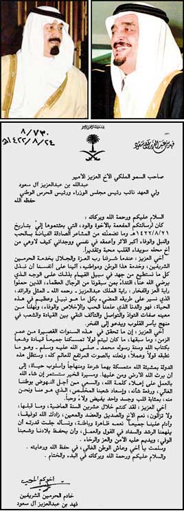 بعث خادم الحرمين الشريفين الملك فهد بن عبدالعزيز آل سعود حفظه الله رسالة جوابية إلى صاحب السمو الملكي الأمير عبدالله بن عبدالعزيز ولي العهد نائب رئيس مجلس الوزراء رئيس الحرس الوطني ردا على رسالة سموه التي بعثها لخادم الحرمين الشريفين يوم الحادي والعشرين من شهر شعبان الحالي بمناسبة مرور عشرين عاما على تولي الملك المفدى مقاليد الحكم .