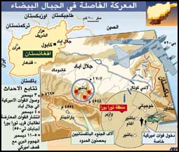 وقالت الوكالة ان الضربات الجوية الأمريكية والهجمات بصواريخ الكروز على تورا بورا. متواصلة .وبات الهجوم النهائي على آخر حصون شبكة القاعدة التي يتزعمها أسامة بن لادن المتهم بالارهاب متوقعا بعد رفض القاعدة الاستسلام طبقا للشروط التي حددتها المجموعات المناوئة لطالبان والتي تسيطر على جبال سبينجهار في إقليم نانجرهار شرق أفغانستان.
