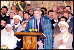 عرفت أفغانستان أمس ولأول مرة منذ خمس سنوات حكومة تحظى بدعم دولي واسع النطاق وذلك عندما أدت حكومة حميد قرضاي الانتقالية اليمين الدستورية في كابول وسط حضور دولي مرموق ولم تؤثر في المناسبة انباءعن سقوط العشرات من زعماء العشائر قتلى في قصف أمريكي فيما كانوا في طريقهم لحضور حفل تنصيب الحكومة لكن واشنطن قالت ان هؤلاء من رجال طالبان.