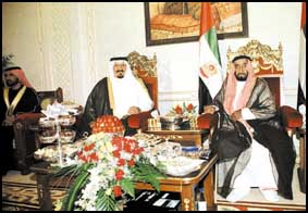 استقبل صاحب السمو الشيخ زايد بن سلطان آل نهيان رئيس دولة الامارات العربية المتحدة بقصر سموه في أبوظبي أمس صاحب السمو الملكي الأمير سلطان بن عبدالعزيز النائب الثاني لرئيس مجلس الوزراء وزير الدفاع والطيران والمفتش العام والوفد المرافق لسموه.