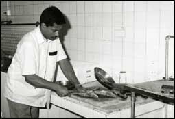 عامل أحد المطاعم يقوم بتقطيع السمك بدون ارتداء للقفازات وهذه مخالفة صريحة في ظل غياب الرقابة، .........