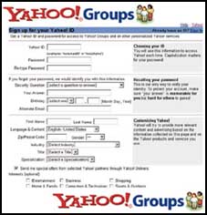 ملاحظة: لمن ليس لديه أي حساب اشتراك في موقع Yahoo فمن موقع القوائم http:// groups.yahoo.com الرئيسي . فتح حساب كمستخدم جديد New users باختيار أمر Click here to register لبدء تسجيل البيانات. ونرى . انه من الأفضل . إنشاء حساب بريد إلكتروني من موقع Yahoo بالعنوانhttp://mail.yahoo.com لنيل كافة خدمات القوائم البريدية.
