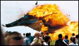 أعرب الرئيس الاوكراني ليونيد كوتشما عن الامل في منع العروض الجوية في بلاده على اثر تحطم طائرة خلال عرض جوي اسفر عن مصرع العشرات فيما اجتذب الحادث الفظيع اهتمام خبراء الطيران حيث شرح احدهم في مقابلة خلال العروض الجوية.