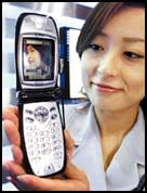 موظفة بإحدى الشركات اليابانية لصناعة الإلكترونيات تعرض هاتفاً جديداً مزوداً بكاميرا تصوير مدمجة ويستطيع صاحب الهاتف إرسال أي صورة يلتقطها بواسطة الإيم.........