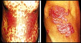 الشكل الأكثر شيوعاً يبدأ ببقع حمراء صغيرة تكبر تدريجيا وتتقشر، وبينما تتوسف القشور السطحية بسهولة فإن القشور التي تحتها تكون ملتصقة بشدة وإذا ما حاولنا قلعها يحدث نزف نقطي، تنمو هذه البقع الحمراء الصغيرة وأحيانا تصبح كبيرة جداً.