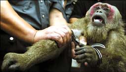 قرد صغير يحاول الهرب من قبضة رجل الشرطة الذي ألقى القبض عليه بعد أن قام بمهاجمة عدد من المارة قرب أحد الأسواق الشعبية في تيانجين بالصين.