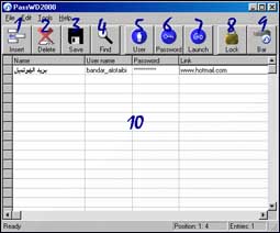 بعد أن تقوم بتحميل البرنامج من الإنترنت وتقوم بتنصيبه في جهازك فانه يمكنك البدء بحفظ وتخزين البيانات التي ترغبها والخاصة بكلمات المرور المتوافرة لديك سواء كانت خاصة بالبريد أو الموقع أو المنتدى أو غيرها وتخشى من فقدانها لكثرتها حيث تقوم بوضع كلمة مرور خاصة بالبرنامج وبعد أن تقوم بتشغيله يمكنك إضافة قائمة جديدة للبيانات من خلال (Insert) ثم تقوم بإضافة اسم البريد أو الموقع ضمن الخيار (Name) واسم المستخدم (User name) وكلمة المرور (Password) وإذا أردت إضافة رابط مباشر للموقع فمن خلال خلال (Link) وجميعها ضمن قائمة البرنامج الرئيسية وهو الخيار رقم (10) ولحفظ هذه البيانات فمن خلال (Save) وهو الخيار رقم (3) ولحذف وإزالة أي قائمة قمت بإضافتها سابقا فمن خلال (Delete) وهو الخيار رقم (2) كما يمكنك البحث ضمن البيانات والقوائم التي قمت بإدخالها سابقا من (Find) وهو الخيار رقم (4) وللانتقال مباشرة للموقع الخاص بأي قائمة ومن خلال (Launch).