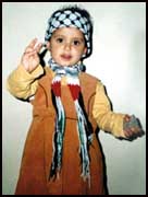 الطفلة الحائلية (ميمونة) والتي لا تتجاوز السنَّة الرابعة من عمرها اعتمرت شماغ أبطال الانتفاضة في فلسطين الغالية على رأسها وحملت في يدها اليسرى حجراً لضرب اليهود ورفعت أصابع يدها اليمنى مشيرة إلى علامة الانتصار والنصر بإذن الله على بني صهيون.