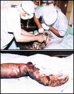 باشر الدفاع المدني مركز السليمانية صباح أمس حادثة هرس ليد العامل «قادر عبدالمتين» بنغالي الجنسية يعمل بأحد محلات الحلويات الواقعة في طريق الأمير سلطان مع شارع العليا. حيث تعرض العامل لهرس يده اليمنى من الكف حتى مرفق الذراع الأيمن داخل فرامة من الحجم الكبير. وقد باشر الحادث فرقتا إنقاذ واسعاف من الدفاع المدني واسعاف الهلال الأحمر. قامت فرقة الانقاذ بفصل الفرامة من موقعها ونقلوها مع العامل للمستشفى الوطني خلال عشر دقائق، الذي استقبل الحالة وعلى الفور تم ادخاله غرفة العمليات لأسعاف العامل. وقد قامت فرقة الانقاذ من الأطباء في غرفة العمليات بعملية قص الفرامة وتحرير يد العامل. بعدها قام الطبيبان بالمستشفى الوطني: استشاري جراحة التجميل د. محمد القطان واستشاري التخدير د. مدحت عبدالفتاح، وقد استغرق قص الماكينة من يد العامل 30:1 من الوقت من قبل الدفاع المدني. وحتى إعداد هذا الخبر لم نحصل على التقرير الطبي النهائي لحالة العامل.