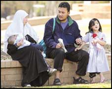 الإندونيسي جاي فضلي مع أسرته يستعد للإدلاء بإفادته أمام الصحفيين في مدينة سيدني باستراليا بعد ان أغارت منظمة استرالية تدعى منظمة الأمن والاستخبارات عل.........
