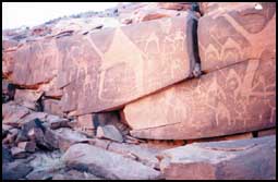 منذ بداية التاريخ الجاهلي وإنسان البداوة إلى آخر العصر الإسلامي وهذه المنطقة تتعاقب عليها الأمم والشعوب حيث يلاحظ نقوش وكتابات دونت في صدر الإسلام وباللغة العربية التي تفتقر للنقط ويمكن إرجاع تاريخها إلى صدر وبداية الإسلام لأنها عبارة عن دعاء إلى الله «اللهم اغفر.. وارحم أنك على كل شيء قدير» كما يوجد هناك نقش على سفح الجبل الشمالي بلفظ الجلالة «.. بسم الله»، وهذه النقوش منقوشة على أحجار بركانية سوداء قد رسمها الفنان الجاهلي في عصور ما قبل الميلاد ومعاد استخدامها في صدر الإسلام.