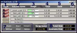 طريقة عمل البرنامج: يعتبر هذا البرنامج من البرامج المميزة التي تعطيك إحصائية دقيقة عن مساحة كافة الأقراص المتوفرة لديك المستخدمة والمتوفرة منها... فبعد أن تقوم بتحميل البرنامج من خلال موقعه على شبكة الإنترنت وعند تشغيل البرنامج فانه ستظهر لديك الواجهة الرئيسية للبرنامج وهي الصورة المرفقة ومنها يمكنك الاطلاع على أنواع الأقراص سواء كانت ثابتة أو متحركة من خلال (Type) وهو الخياررقم (1) بالإضافة إلى أسماء محركات الأقراص لديك من خلال (Volume name) وهو الخيار رقم (2) ولمعرفة النسبة المستهلكة في كل قرص لديك فمن خلال الخيار رقم (3) وهو (Usage) أما إذا رغبت في معرفة الحجم الإجمالي لكل قرص متوفر لديك فمن خلال (Total) وهو الخيار رقم (4) أما للاطلاع على المساحة المستخدمة في كل قرص لديك فمن خلال (Used) وهو الخيار رقم (5) ولمعرفة المساحة الحرة المتوفرة على كل قرص فمن خلال (Free) وكافة هذه المعلومات لكل قرص على حدة أما في حال رغبتك معرفة إجمالي حجم الأقراص المتوفرة لديك والمساحة المتوفرة .
