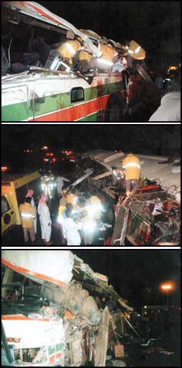 من جانبه قام مدير عام الشؤون الصحية بمنطقة الرياض الدكتور حمد المانع بزيارة اقسام الطوارئ في المستشفيات التي استقبلت المصابين وزار المصابين واطمأن على احوالهم التي كانت ظواهرها ليست خطيرة بإذن الله حيث تم إخراج العديد منهم بعد تلقي العلاج والتأكد من عدم اصابته باصابة تعيق خروجه من المستشفى. «الجزيرة» التقت بالدكتور المانع في مستشفى الايمان العام وصرح قائلا: ان توجيه سمو أمير منطقة الرياض الأمير سلمان بن عبدالعزيز - حفظه الله - باستقبال الحالات المصابة الناتجه عن الحادث كشفت مدى الامكانيات التي تتمتع بها الخدمات الصحية ومدى التطور في الامكانيات والتعامل مع كافة الحالات الطارئة وغيرها لتحقيق سرعة العلاج وانقاذ ارواح المصابين حيث كان لاستعداد زملائنا في مستشفيات منطقة الرياض وخاصة التي استقبلت الحالات الاثر الايجابي في التعامل مع المصابين وسرعة علاجهم وتخفيف مصابهم ومعاناتهم، كما كان لزملائنا الميدانيين دورهم وعلى رأسهم رئيس الفريق الطبي الميداني بالشؤون الصحية الفني/ أنور العفنان والذي اكد وزملاؤه حسن تعاملهم مع الحادث بالسرعة المطلوبة من عملية الفرز وتوجيه الفرق الاسعافية لنقل المصابين والتي شارك فيها رجال الهلال الاحمر بتفان ملحوظ وتوزيع المصابين والمتوفين على المستشفيات كل حسب استيعابه. واشار المانع الى ان متابعة سمو أمير منطقة الرياض لهذا الحادث تركت الاثر البالغ على نفوس المصابين الذين كان يتابعهم لحظة بلحظة للاطمئنان على صحتهم وهذا ليس بمستغرب على سموه فقد عودنا جميعا على الوقوف على كل شيء بحرص ومتابعة دقيقة وخاصة في كل ما يمس المواطن وحياته بشكل مباشر.