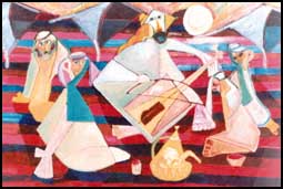 3- التكوين المعماري، وهي المرحلة التي اندمج فيها الشكل والعنصر معا ليشكلا مساحات وخطوطاً متنوعة في الحجم والخط واللون والمعالجة التقنية للسطح، كما انصهرت الأرضية والخلفية مع تلك المساحات لتشكل عملا واحدا في تكوين واحد.